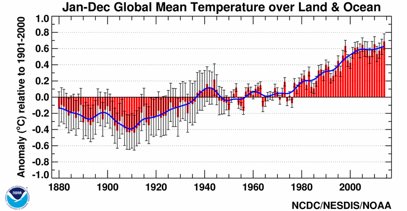 Averaged over all land and ocean surfaces, temperatures warmed roughly 1.53°F (0.85ºC) from 1880 to 2012, according to the Intergovernmental Panel on Climate Change (see page 3 of the IPCC's Climate Change 2013: The Physical Science Basis, Summary for Policymakers - PDF ). |
