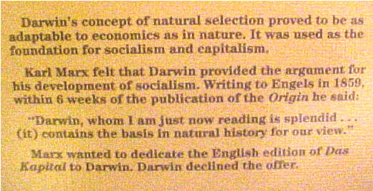 Under a picture of Karl Marx the museum displays the caption to the right. Darwin's theory did influence Karl Marx. That's a fact. Hitler also used Darwin's theory to justify the extermination of Jews, but the museum fails to mention that. |