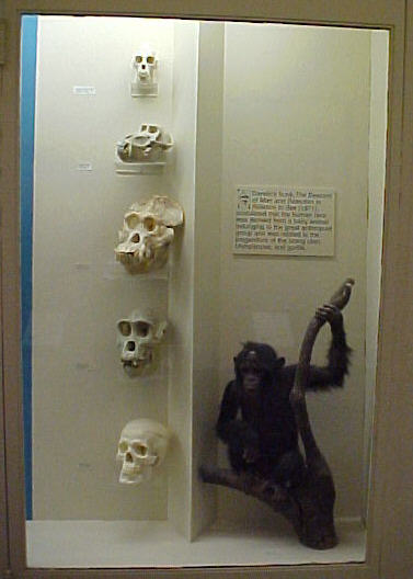 What we do object to, and we suspect even some evolutionists might object to, is their very misleading display of primate skulls. The top skull is a howler monkey, the bottom is human, and the intermediate skulls are other apes. Why are these skulls displayed this way? The casual observer would get the impression that howler monkeys evolved into orangutans, which evolved into gorillas, which evolved into man. That isn't an accurate representation of what evolutionists believe. Why display a human skull along side of ape skulls? What other reason could there be than to imply that there is scientific evidence of a common ancestor? |