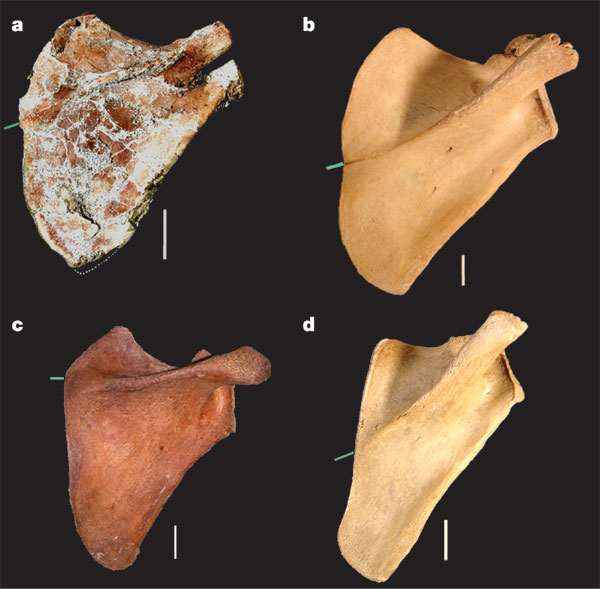 Their picture compares the DIK-1-1 scapula (a) with gorilla (b), human (c), and chimp (d) scapulae.
