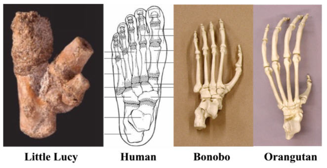 We don't claim to be experts in foot anatomy, so we will leave it to you to compare Little Lucy's foot with the human foot 13, the bonobo foot 14 and the orangutan foot 15.
