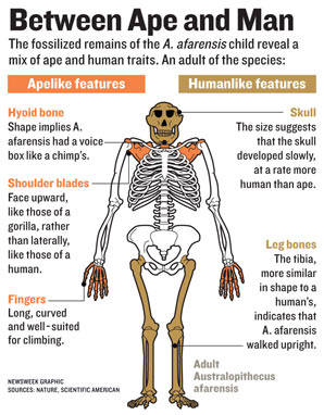 So far, Selam has mostly confirmed what scientists already suspected: her species walked upright, with a mosaic of proto-human and proto-ape traits. But she has also kicked off a few arguments. Her discoverers point to her shoulder blade and curved fingers as evidence that she often climbed trees. White, on the other hand, says, "There's been substantial arm-waving about that." He thinks the traits are evolutionary leftovers from Lucy's tree-dwelling ancestors, not yet replaced by natural selection. 18 |