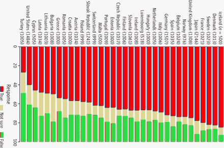 You no doubt have seen the results of opinion polls showing that fewer Americans believe the theory of evolution now than several years ago. Now, a study in the journal Science shows that a smaller percentage of Americans believe in evolution than nearly every other civilized nation studied. 1 They used two subtle tricks in the graph on the left to make America look bad. They put the United States near the bottom of the heap, and lots of red to imply danger. Simply turning the graph on its side and using different colors makes the United States appear to be the second best country, and Iceland the worst.