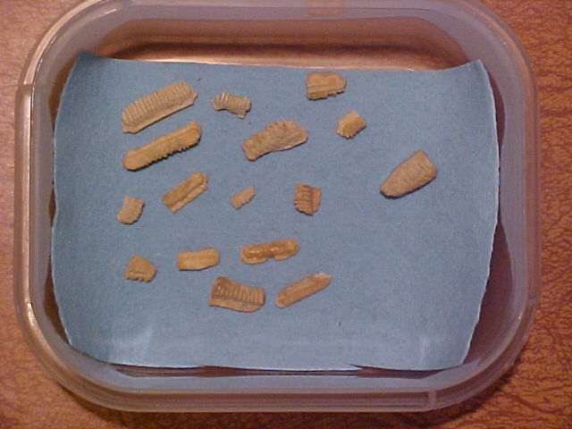 I discovered that the best way to find the fossils was to take big chunks of sediment back home. At home I put the chunks in a plastic tub of water, where they immediately turned to mud. I put the mud in a kitchen sieve and washed the mud away, leaving the teeth and a little bit of gravel in the sieve. Many of the shark teeth I found were less than ΒΌ inch (6 mm).