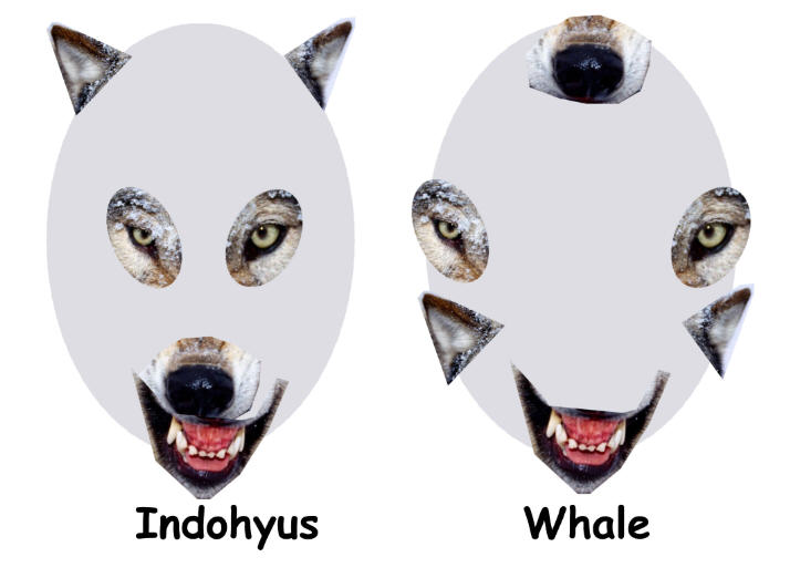 We should point out there are some differences that we think are significant. Indohyus has a nose at the front of its skull, near its mouth. Whales have their noses at the back of their skulls. Indohyus has closely set eyes in the center of its face. Whales have eyes on the sides of their heads. Indohyus has ears on the top of its skull. Whales have ears on the sides of their skulls. The differences are clearly shown below.