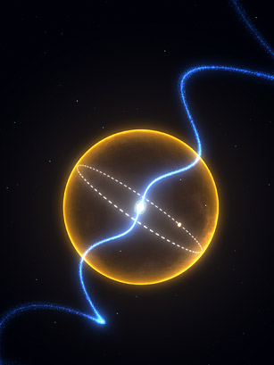 | An artist's conception of the pulsar PSR J1719-1438 (bright dot, center) and the Jupiter-mass planet that orbits it (smaller dot, with the orbit traced by a dashed line) |