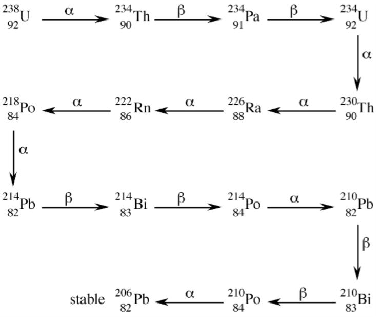 Uranium is a typical heavy radioactive atom. It decays to lead in a series of steps shown in the diagram 3 below.