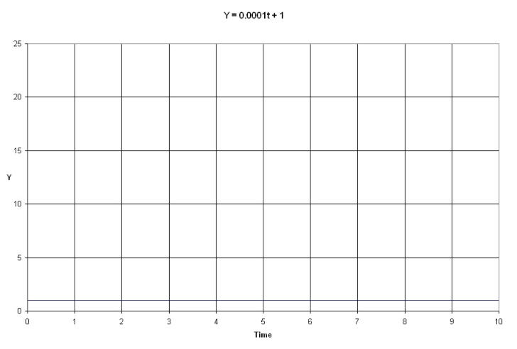 The value of Y changes very little with TIME. You can't tell it from the graph, but the value of Y at TIME = 1 is 1.0001, and the value of Y at TIME = 7 is 1.0007; and that is exactly the point--you can't tell it from the graph. Y changes so slowly with TIME that it is hard to tell the relationship between TIME and Y. Small changes in Y imply large changes in TIME. When the slope is flat like this, contamination can be a very big problem. Just a small measurement error in Y results in huge errors in the calculated age. So, processes that change slowly with time don't give accurate age measurements.