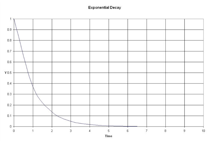 A really important natural function is called "exponential decay." It is of interest to electrical engineers because it describes the voltage decay on a discharging capacitor (among other things). We, however, are interested in it because it describes radioactive decay. The graph below shows exponential decay, with time measured in "time constants" called "tau." (Tau is the Greek letter, τ.) The equation is e-t/τ, which is read as "e to the minus t over tau." ("e" is the "natural number," which has a value of roughly 2.7. It is a number like pi that describes natural physical processes, like the decay of voltage on a capacitor, radioactive decay, and lots of other natural things.)