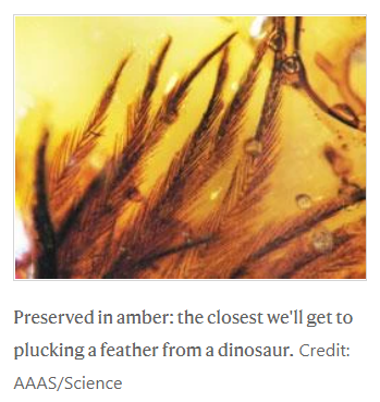 In September, there were several articles about dinosaur feathers found in amber. Roughly 4,000 amber samples from a particular location in Canada had been collected over the years and stored in various museums. Some dedicated scientists examined all of them, looking for feathers, and found 11 samples that contained feathers. They analyzed them, and reported their findings in the professional literature.