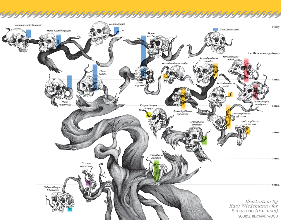 Bernard Wood, Scientific American, September 2014, "Welcome to the Family", page 43, https://www.scientificamerican.com/article/the-latest-fossil-finds-make-the-puzzle-of-human-evolution-harder-than-ever-to-solve/