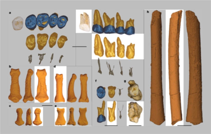 | Continued excavations in Callao Cave (Fig. 1) that originally yielded the hominin third metatarsal (which we here call CCH1 for 'Callao Cave Hominin 1') have produced another twelve hominin elements (Extended Data Fig. 1a) from the same stratigraphic layer (layer 14): seven postcanine maxillary teeth (CCH6-a to CCH6-e, CCH8, CCH9; Fig. 2a, f, g), two manual phalanges [hand bones] (CCH2 and CCH5; Fig. 2b, c), two pedal phalanges [foot bones] (CCH3 and CCH4; Fig. 2d, e) and a femoral shaft [leg bone] (CCH7; Fig. 2h). CCH1 and CCH6-a are directly dated by U-series analysis to minimum ages of 67 thousand years (kyr) and 50 kyr, respectively. Crown morphology, grade of occlusal wear and exact correspondences of interproximal contact facets demonstrate that five of the upper right teeth belonged to a single individual (CCH6-a to CCH6-e; Extended Data Fig. 1b-g and Supplementary Information). The presence of two right upper third molars (M3; CCH6-a and CCH9) and a juvenile femoral shaft (CCH7) indicates that at least three individuals are represented. On the basis of the unique mosaic of primitive (that is, Australopithecus-like) and derived (that is, H. sapiens-like) morphological features observed on these specimens, we assign them to a new species, H. luzonensis. 6 |