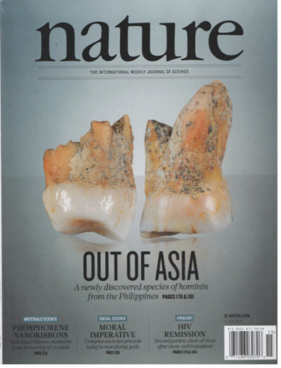 Judging from the cover, the editors of Nature think speculation about some teeth is more interesting to their readers than an effective breast cancer treatment. Admittedly, the breast cancer article might be as bogus as the H. luzonensis article. We are in no position to judge. We simply want to point out how obsession with evolution diverts attention from more important scientific studies.
