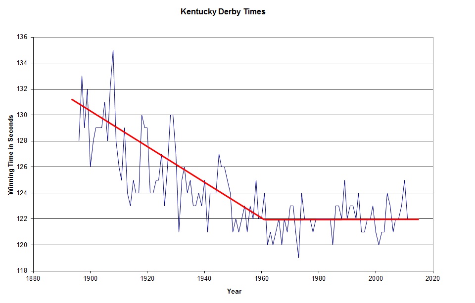 Here is a table of the Kentucky Derby winning times (in seconds) for the last 104 years. If you graph this data you can see there has been no noticeable improvement for the last 50 years. The average winning time for all 104 years is 124.3 seconds. In the last 50 years that average decreased to 122.1 seconds. In the 1990's, the ten winning times varied from 121 seconds to 125 seconds, averaging 122.4 seconds, which is 0.3 seconds slower than the average winning time for the last 50 years. Or, to put it in terms more familiar to American motorists, the average winning speed from 1950 through 1989 was 36.893 mph, and in the last 10 years it has decreased to 36.768 mph. The Kentucky Derby data does not show increasing speed without limit. It shows remarkable consistency, which seems to indicate that the limit may already have been reached. When researching the Kentucky Derby data, we stumbled across this interesting passage in the Thoroughbred Times On-Line Stallion Directory.