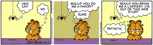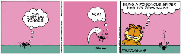 There are also poisonous amphibians (frogs, for example), which have evolved poison (but not fangs). This is remarkable because the evolution of poison is obviously very dangerous. As Jim Davis' cartoon points out, bad things could happen if you bite your own tongue.