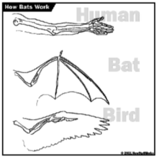 But even if you say structure is the most important criterion, what is it about the structure of the bat wing that makes it more like a human arm than a bird wing? Presumably it is because the bat wing has a thumb and three fingers coming off a wrist-like joint, which is more like a human thumb and four fingers than the bones in the bird's wing. But there are two bones between the elbow and wrist in a human arm and a bird wing, and only one in a bat. If the number of bones between the elbow and wrist are most important, then a human arm is more like a bird wing than a bat wing.
